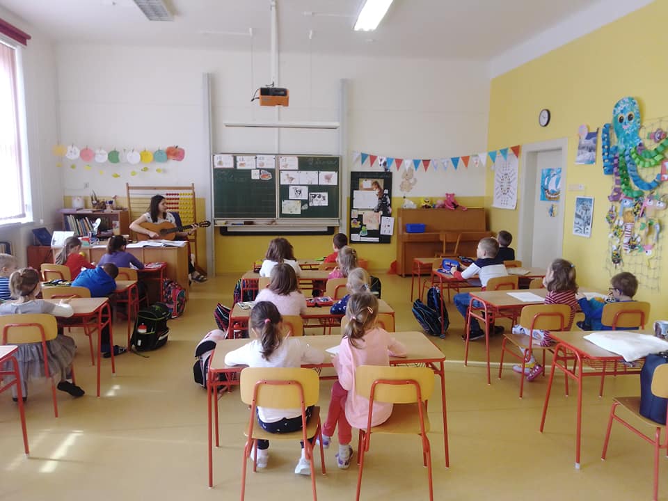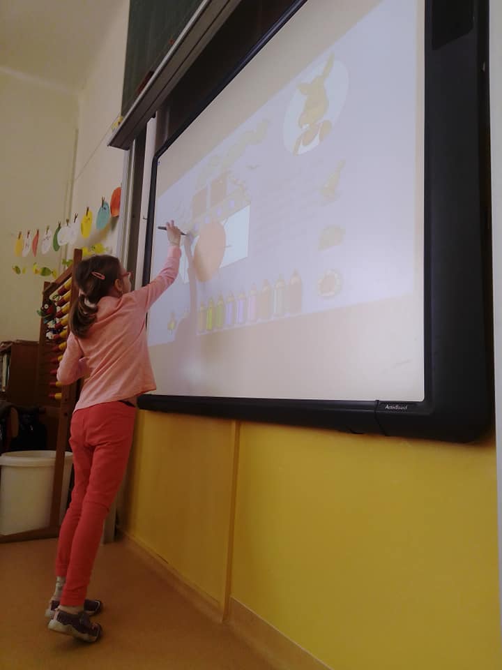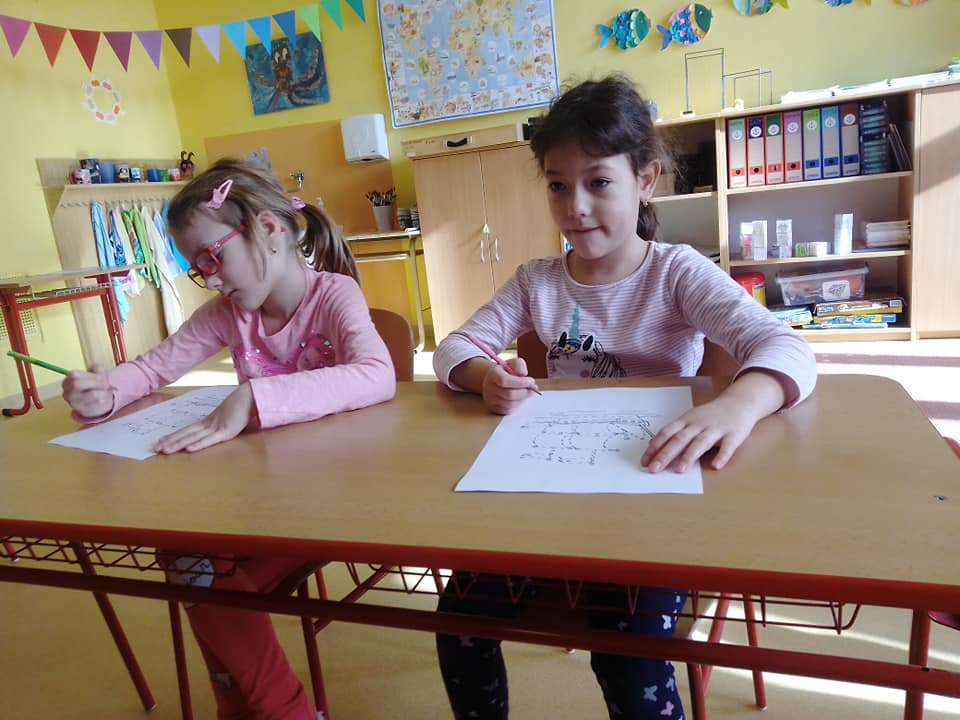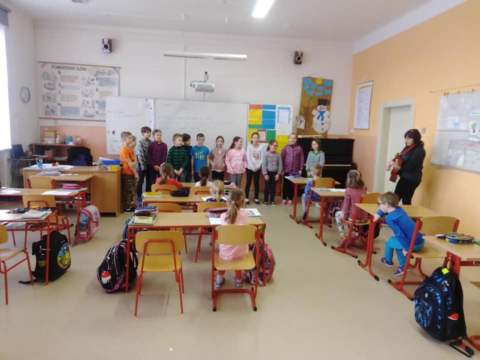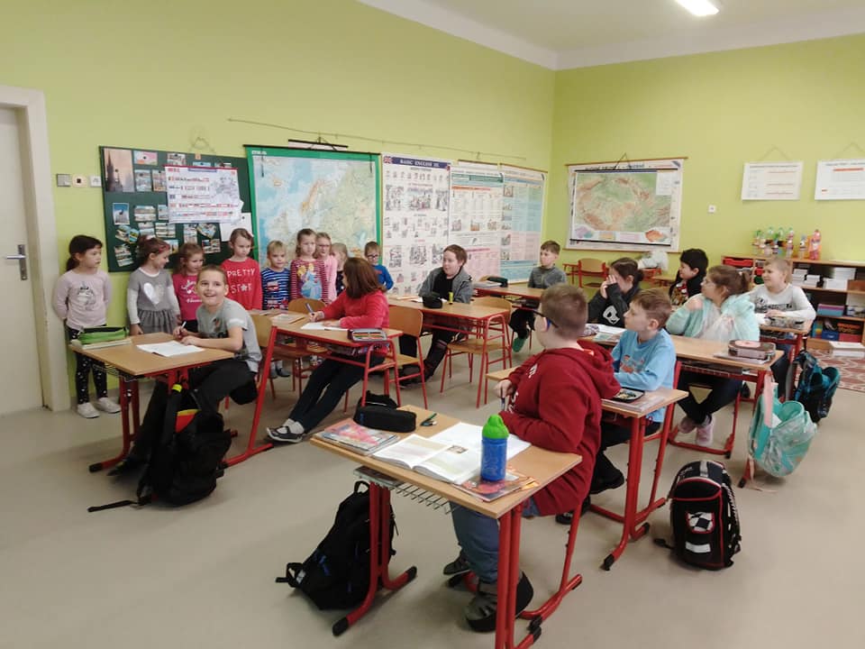 Ve škole jsme nejdříve navštívili prvňáčky, kde jsme společně s paní učitelkou plnili několik úkolů. Vyzkoušeli jsme si interaktivní tabuli, splnili úkoly z pracovních listů, a při práci jsme bedlivě poslouchali druháky, kteří nám četli pohádku O Budulínkovi. Na závěr jsme si u prvňáčků zazpívali písničku. U třeťáků se zrovna také zpívalo - ukázali nám, že hudební výchova není žádná věda, ale je to zábava. Ti nejstarší čtvrťáci a páťáci nás viděli obzvlášť rádi, nemuseli se chvíli soustředit na český jazyk.